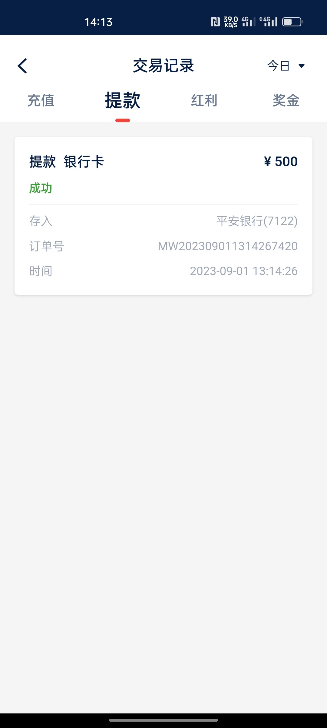 没有领取68,自己冲的100块钱,打麻将2打出来的。最后还剩56块钱,4块4块打,打到还剩29块钱,因为我是预计在这个位置进胡,进两个胡,爆832,没打上去,500提现了。