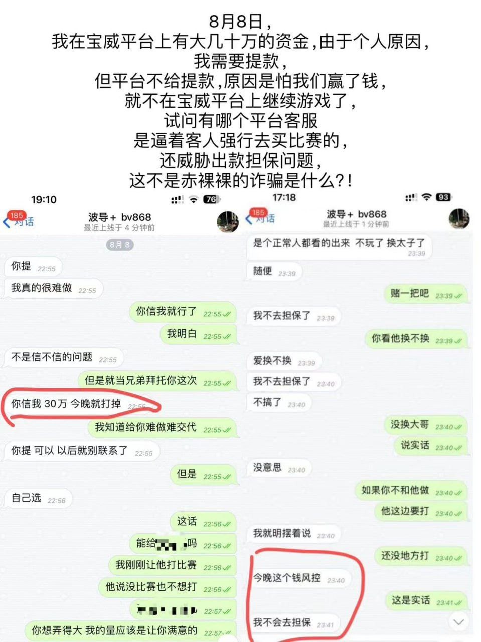 故事的起因在今年3月份,本人经过朋友推荐认识一个宝威平台名叫波导的代理,欧洲杯期间由于一开始上下分都非常正常,并且波导给我大量的平台优惠政策,想我投注量流水更大,当时本人觉得对自己来说无伤大雅,所以就按照他的要求对宝威平台进行充值。