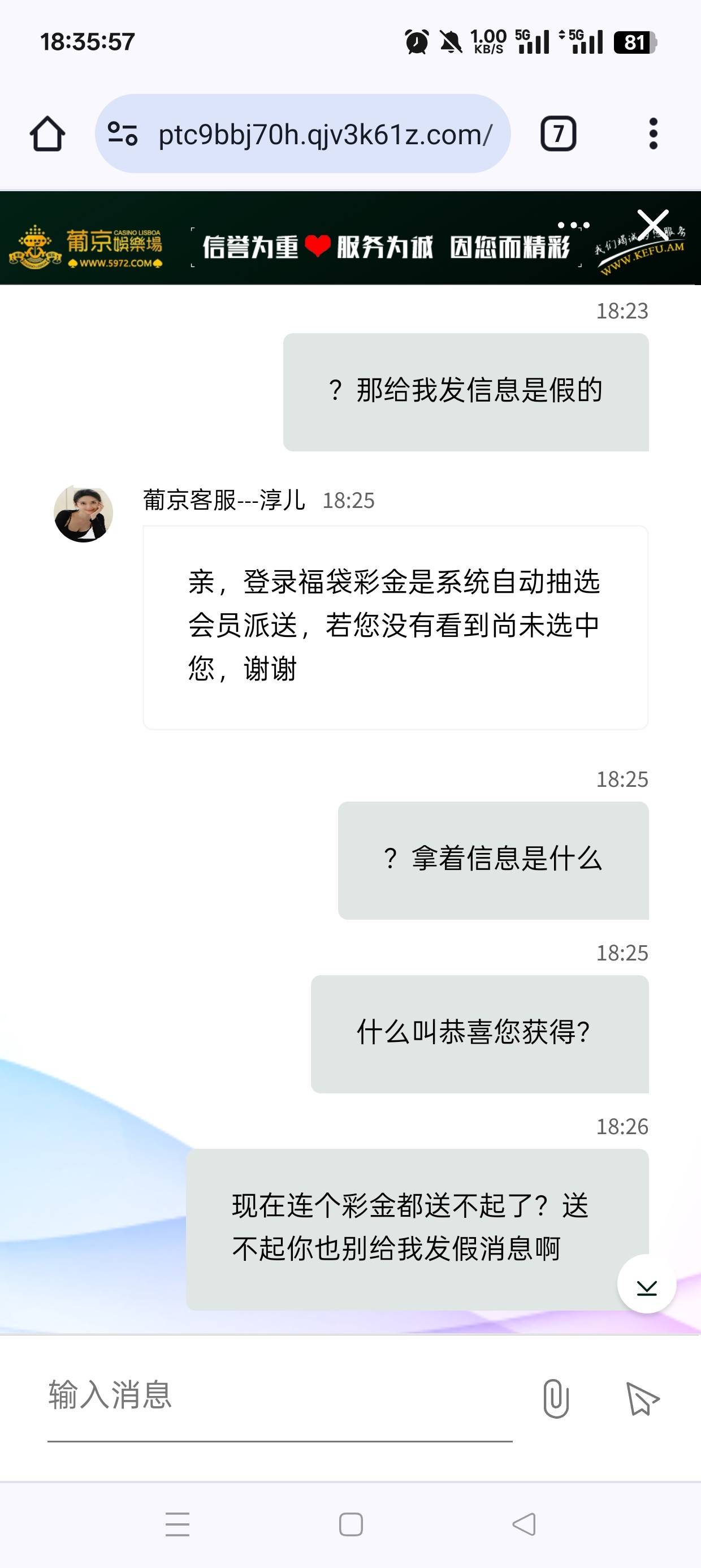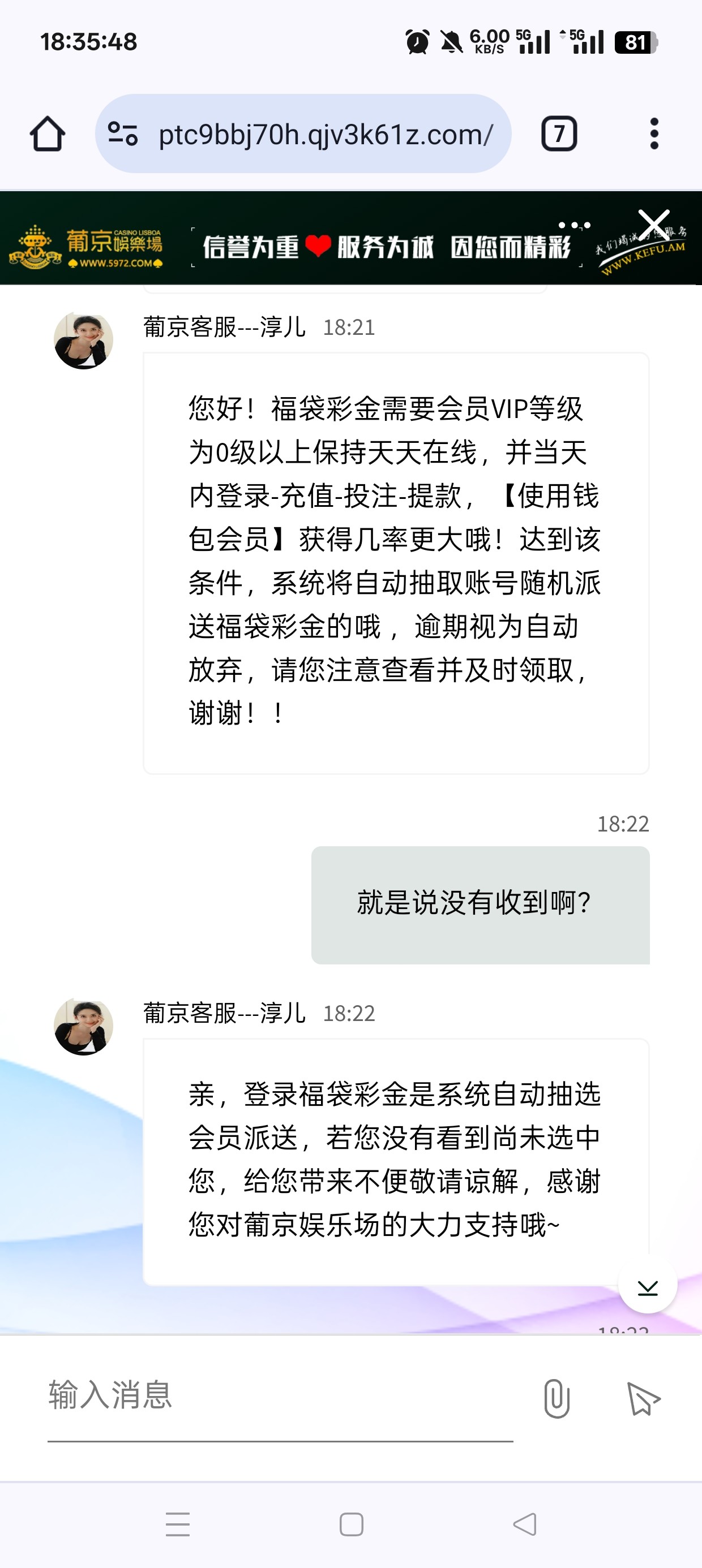 几年的杀猪台了,现在竟然连个彩金都送不起给我发的假消息,以前这个福袋送过好多次了,去问客服直接给我把消息删了还在狡辩,这个逼台子就是这样的每次一有问题就是不敢正面回答的,只会东扯西扯模糊问题自己的问题是不敢承认的只敢做不敢当,杀了我两年了估计看我现在这一两个月我不怎么送钱了连活动都是假的了,应该觉得把我榨干了没必要留我了吧,掉到v7了,我现在就充点维持着领个月彩金基本都是纯送打不出来的,觉得给我这猪杀干净了吧已经不把玩家当人了