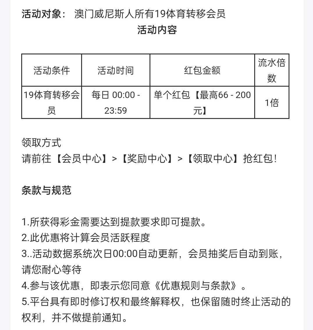 19体育与威尼斯合并转移彩金,具体账号规则看下面文字,老用户登录最低领66红包,具体自测吧,有点麻烦勿充值。用户名少于6码的会员账号需要在后面加上【19TY】。默认密码规则:会员账号前4码 +银行账号4个尾号。如果未绑定银行信息,则默认密码为【会员账号】前4码 +201919。