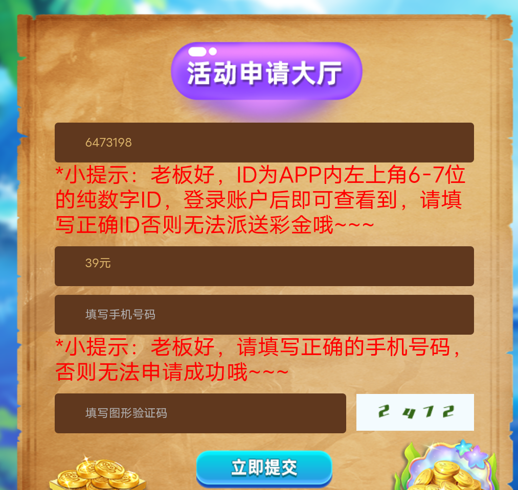 新用户注册绑卡秒4,优惠大厅自助申请39,一共43,只可捕鱼和棋牌200元提现,不送无视,应该是特邀,我也没有收到短信就申请看看吧,勿充值