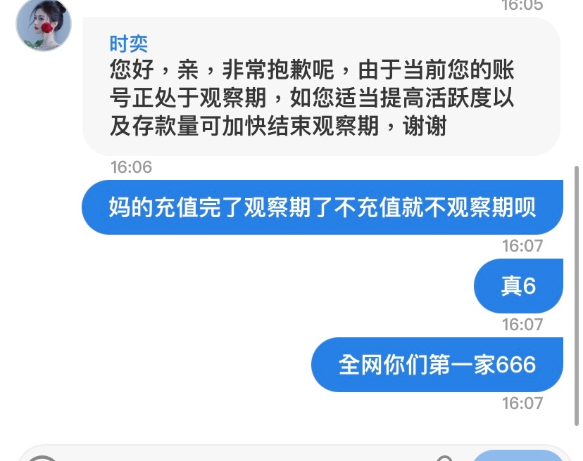 没充值之前一点事没有充值完说我账号被观察期了虽然没被黑但是有点气