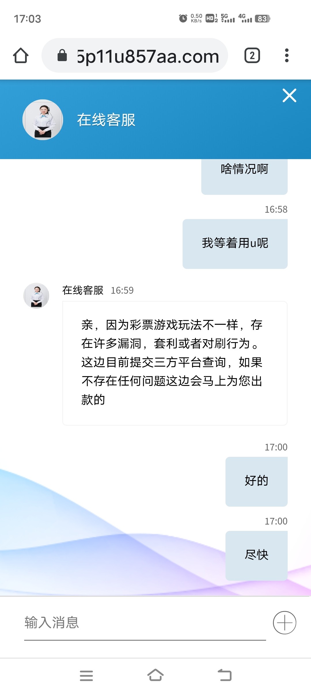 7767...9099这两个域名的威尼斯人是黑台子,飞机上客服管理员名字蓝天,大家记住了千万别去玩,看图。我之前一直输,19号500打到2.8,之前出了,后面号里加起来还有2个多都被黑了,客服之前一直说审核注单。今天查到我没问题,什么都不说直接就把我黑了。在玩的兄弟们趁早走。飞机群经常有人被黑。都是这个平台。