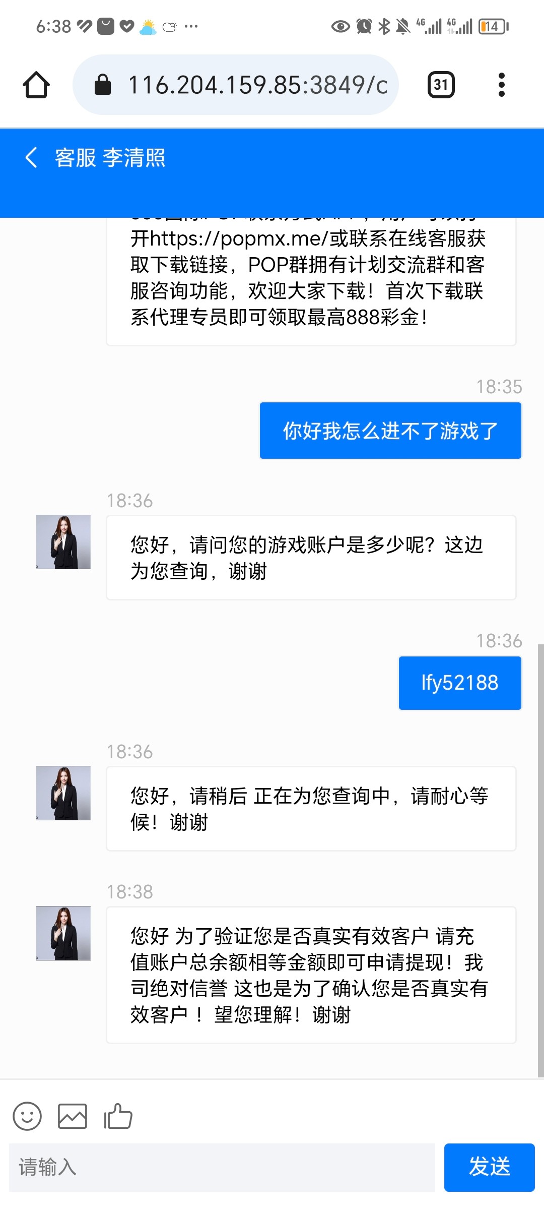 这个b平台老子冲100上500提现跟我说在冲300激活又打上了8000让我冲等同一杯水提马勒戈壁后面把我密码改了登不上去pop客服也是傻逼