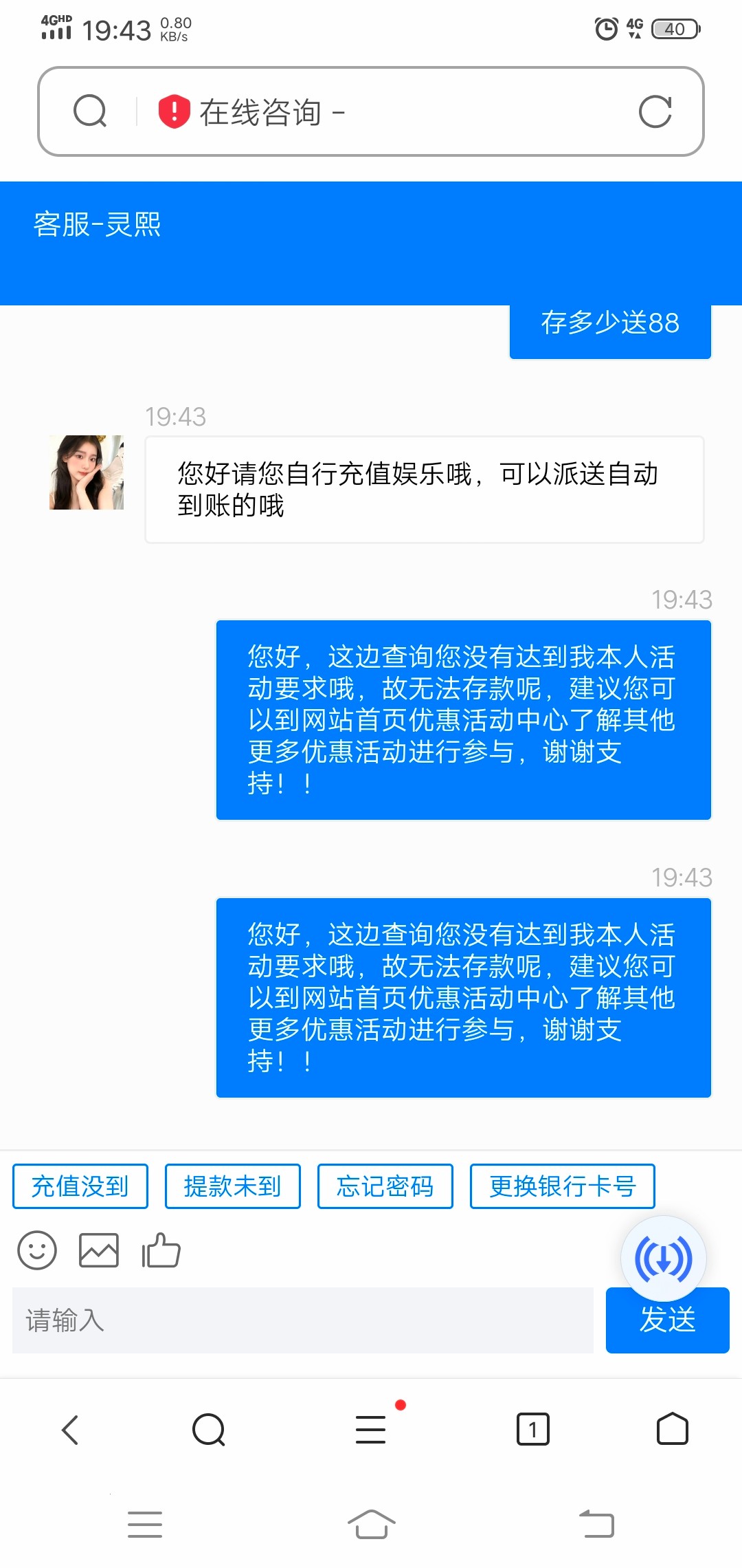 您好,这边查询您没有达到我司活动要求哦,故无法为您派送彩金呢,建议您可以到网站首页优惠活动中心了解其他更多优惠活动进行参与,谢谢支持!!