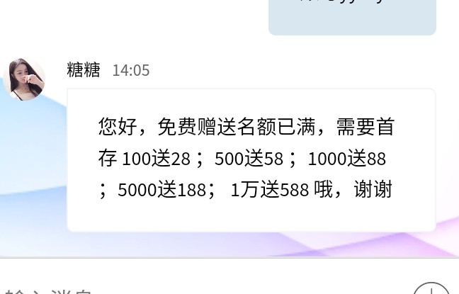 您好,免费赠送名额已满,需要首存 100送28 ;500送58 ;1000送88 ;5000送188; 1万送588 哦,谢谢