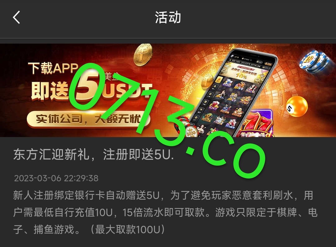 注册绑定银行卡秒送5u要手机号和银行卡实名一样 最低提现30U 最高提现100U 提现要充值10U 10倍流水 无游戏限制 一个老台了(充不充自行选择被黑别来找我就行)