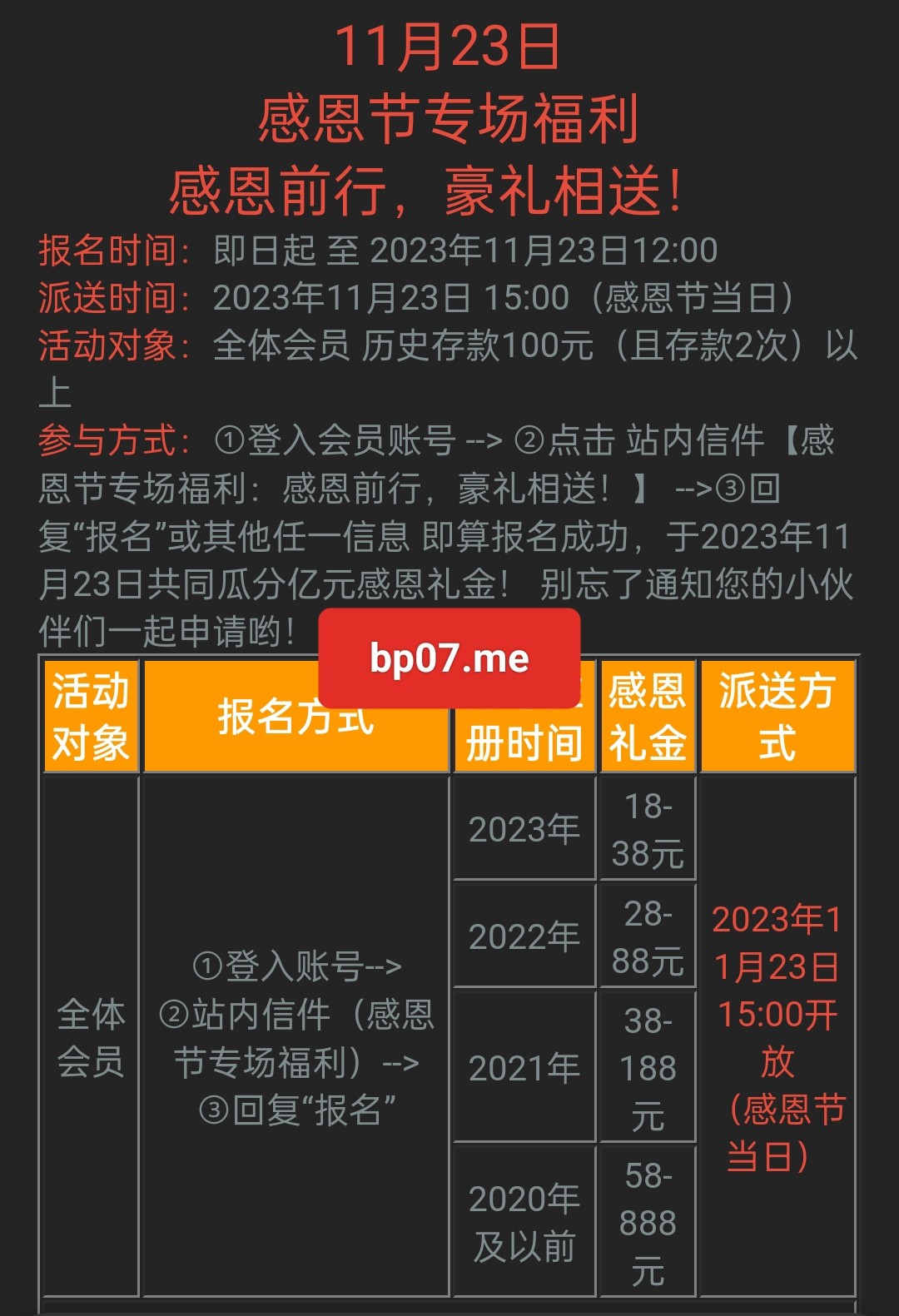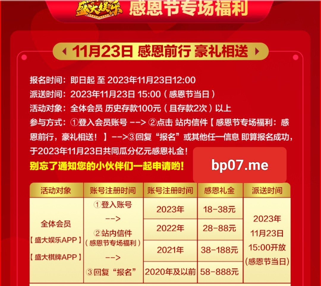 具体仔细查看活动内容 新用户无视!老用户历史充值100以上充值2次以上参与方式:①登入会员账号 --> ②点击 站内信件【感恩节专场福利:感恩前行,豪礼相送!】 -->③回复“报名”或其他任一信息 即算报名成功,于2023年11月23日共同瓜分亿元感恩礼金!