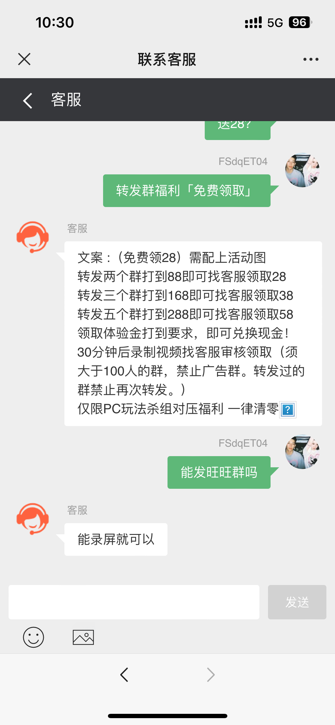 送28玩到288下58  能发到旺旺群或者其他软件的群 过半个小时截图给客服就能领