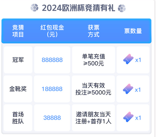 【首投保障】欧洲杯狂欢季,首投专属包赔福利,让您无忧参与!【幸运爆棚】巨额彩金大奖等你挑战,勇攀欧洲之巅,赢得彩金!【巅峰对决】C罗携手姆巴佩,精彩绝伦,1888大奖助您畅享盛宴!【竞猜赢礼金】6月欧洲之巅-传奇对决,竞猜赢取丰厚礼金,敬请期待!
