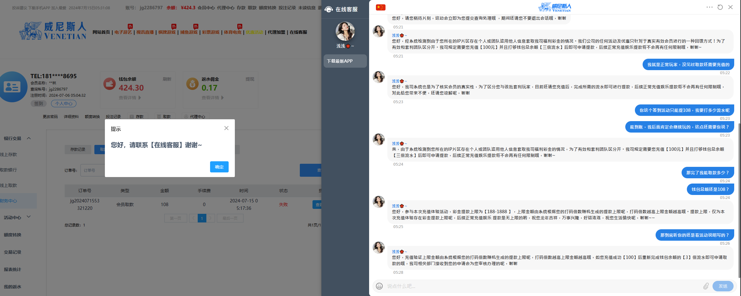 这种垃圾狗逼台子,前几天签到送的赢到424,取款108都不给出,我都懒得发出来。