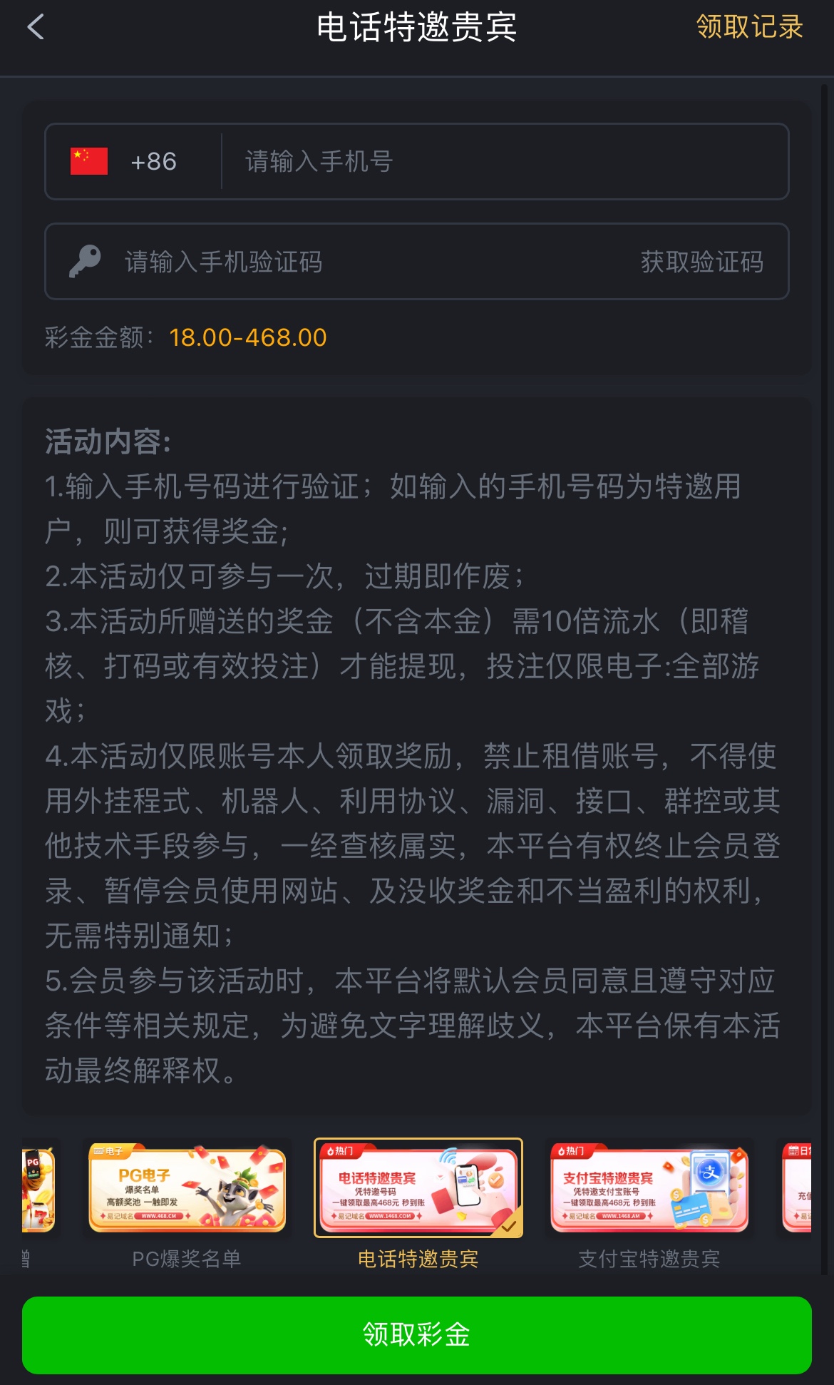 碰瓷电话/支付宝特邀,彩金10倍流水,限电子