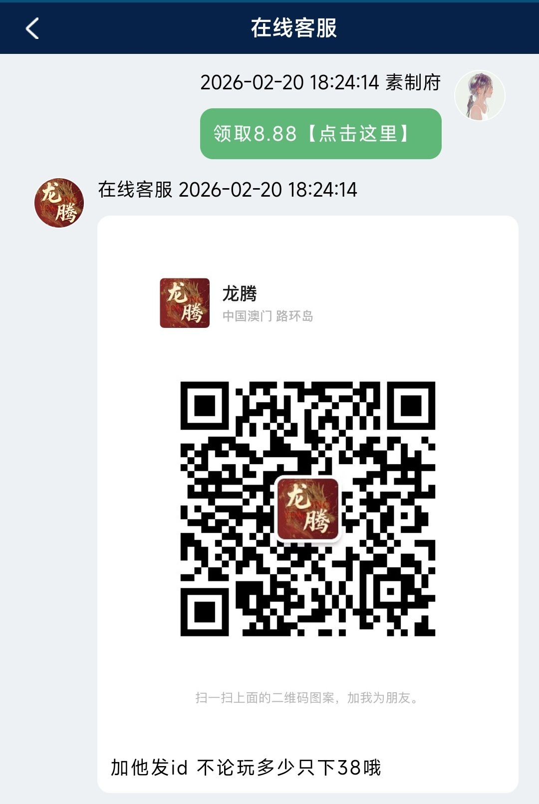 微信扫码登入联系客服在常见问题里点8.88然后加微信发ID给他送8.88无论打到多少金额都是只能下38