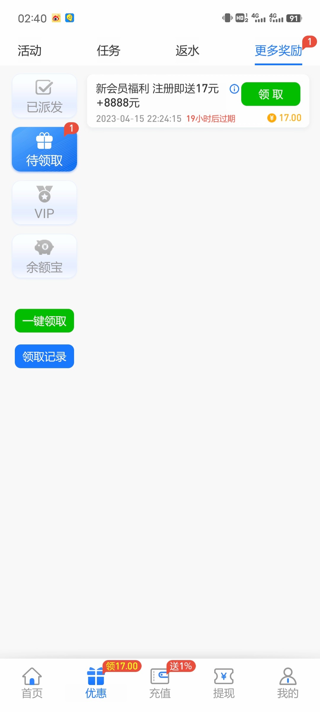 7.38彩金提现了50到账