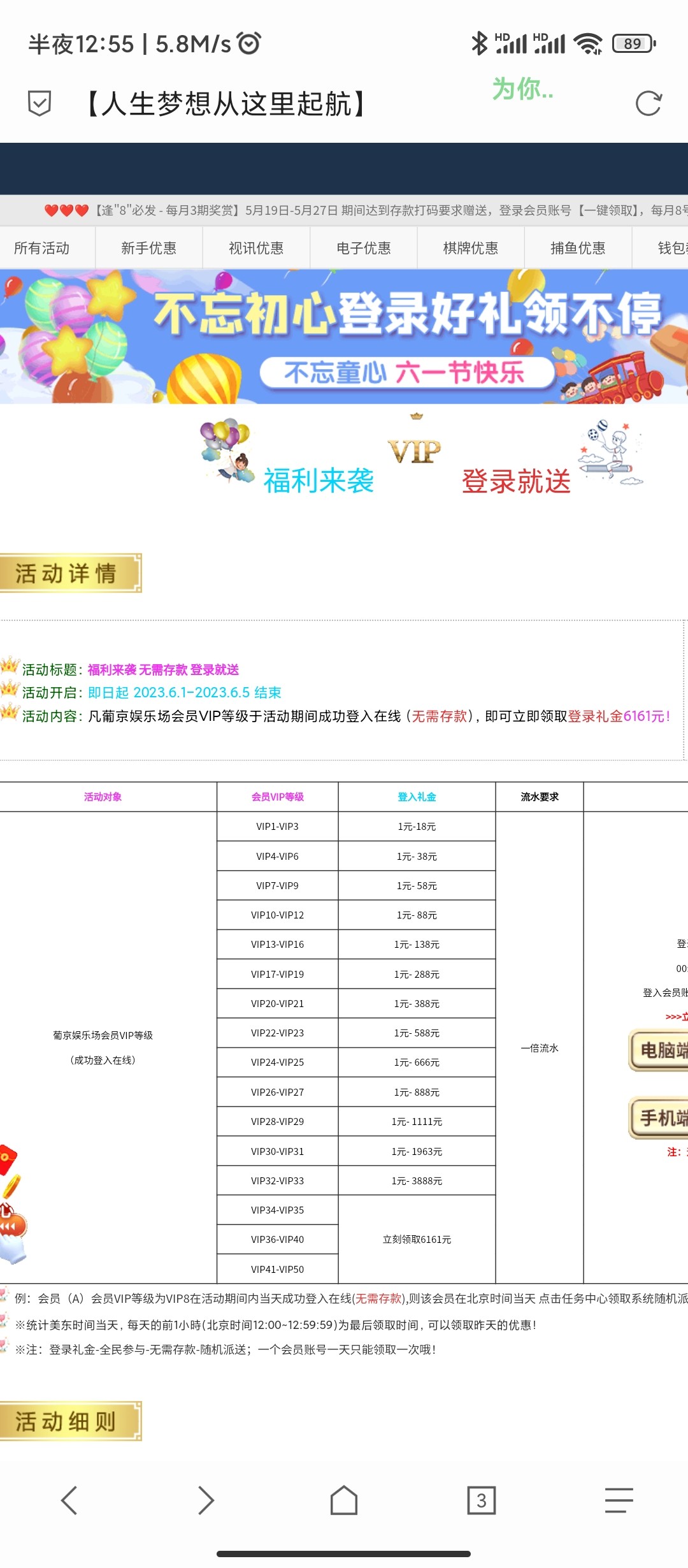 活动期间成功登入在线(无需存款),即可立即领取登录礼金