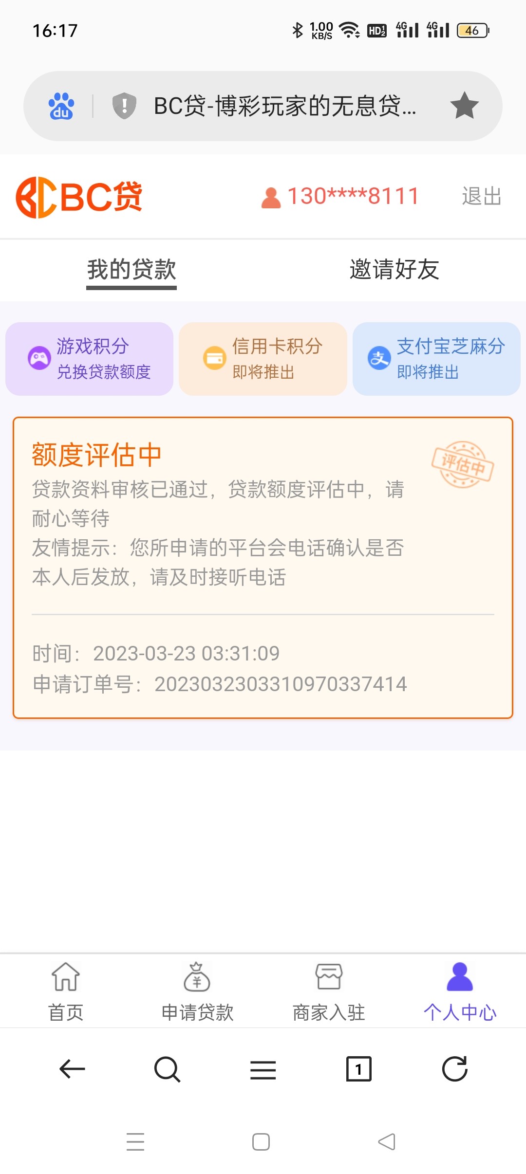 三天审核,第四天审核通过评估额度中,澳门金沙三万流水还是负盈利。博天堂的打了两个电话,bc贷一个电话没打,第五天审核失败。