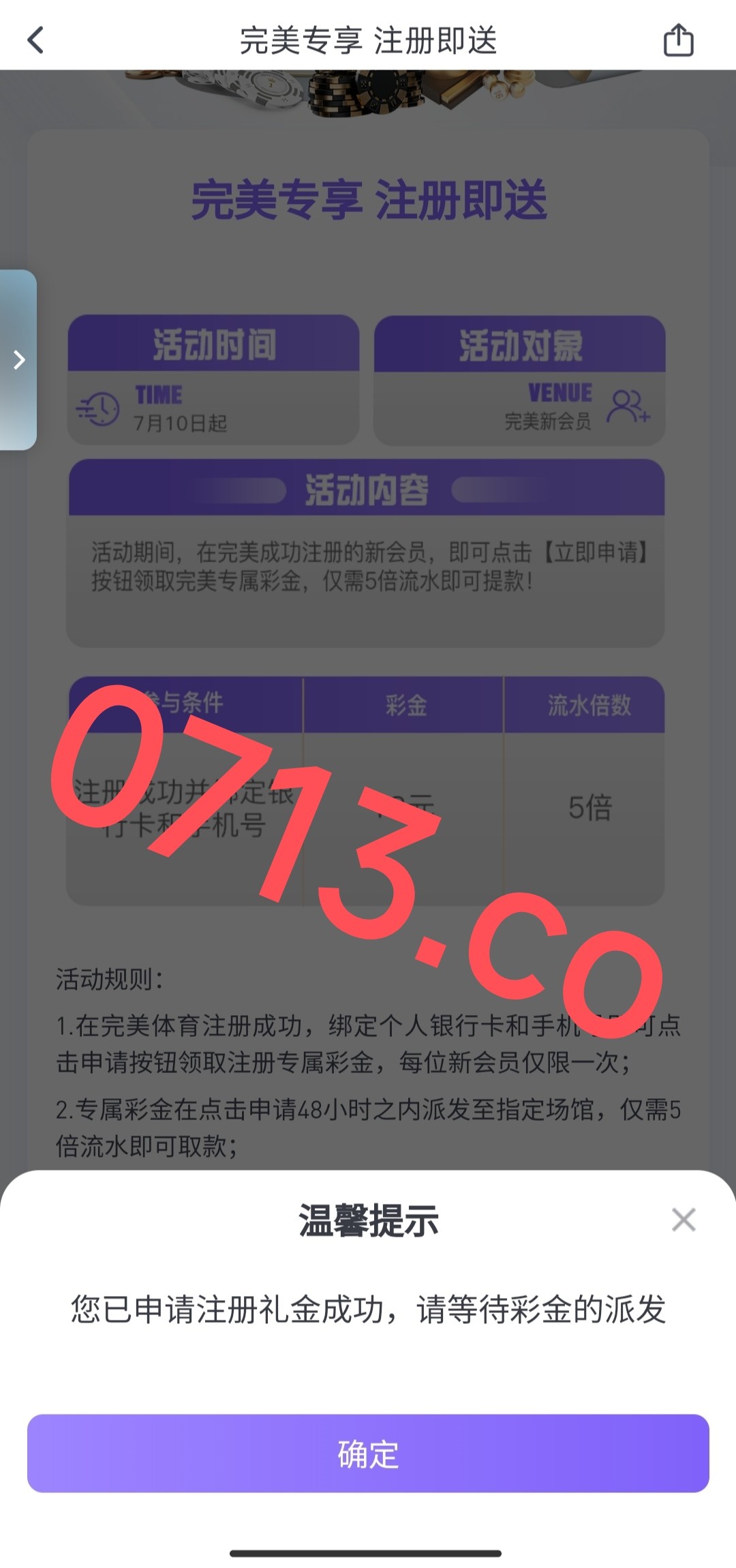 新用户注册 绑卡 手机号 去活动那里申请!48小时内送 五倍流水 最高提款200!彩金是发到指定场馆!亲测刚刚申请了目前还没送!48小时内没送就是查IP了!链接有点卡耐心等等就好了! 我看了之前的贴有老哥在完美体育无缘无故被黑款6万元!禁止充值!